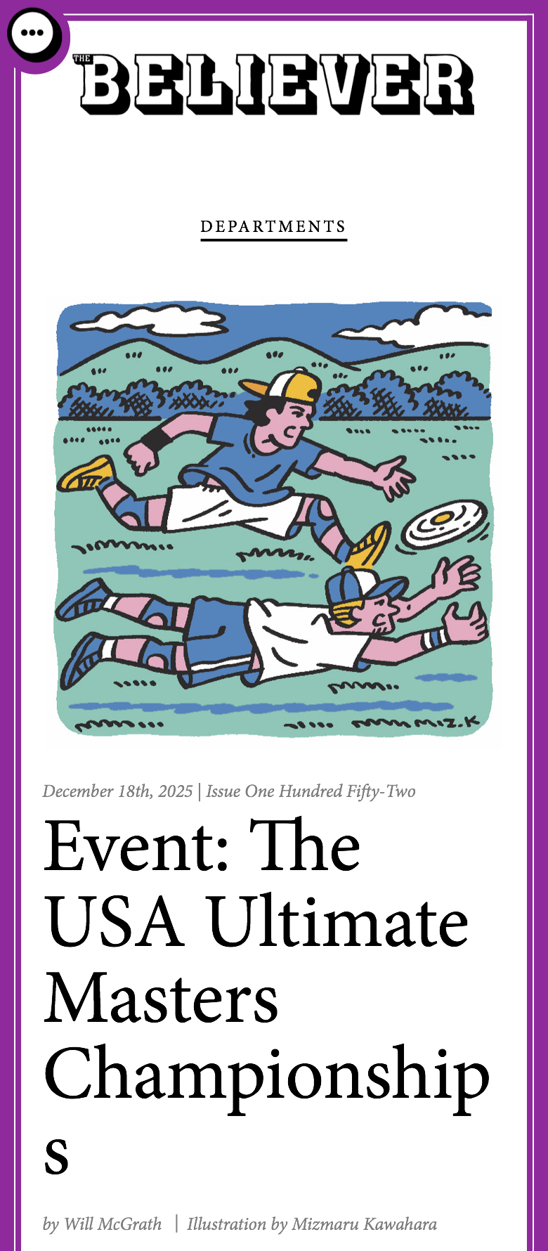 サンフランシスコ発の文化誌「The Believer」にて、Elvia Wilk氏のエッセイ「How To Snow a Mountain」とWill McGrath氏のエッセイ「The USA Ultimate Masters Championships」の挿絵を描きました。